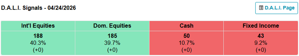 Below is the most recent D.A.L.I. (Dynamic Asset Level Investing) Indicator showing International Equities and Domestic Equities in the top two spots, while both maintain a commanding lead over Cash and Fixed Income.
