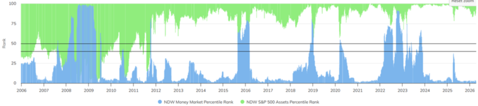 The current reading for the PR4050 is: Money Market = 2.11% & U.S. Equity Core = 97.18%. For the PR4050 indicator to trigger and alert us when we should consider moving to cash, Money Market must be 50% or above and U.S. Equity Core must be 40% or below.