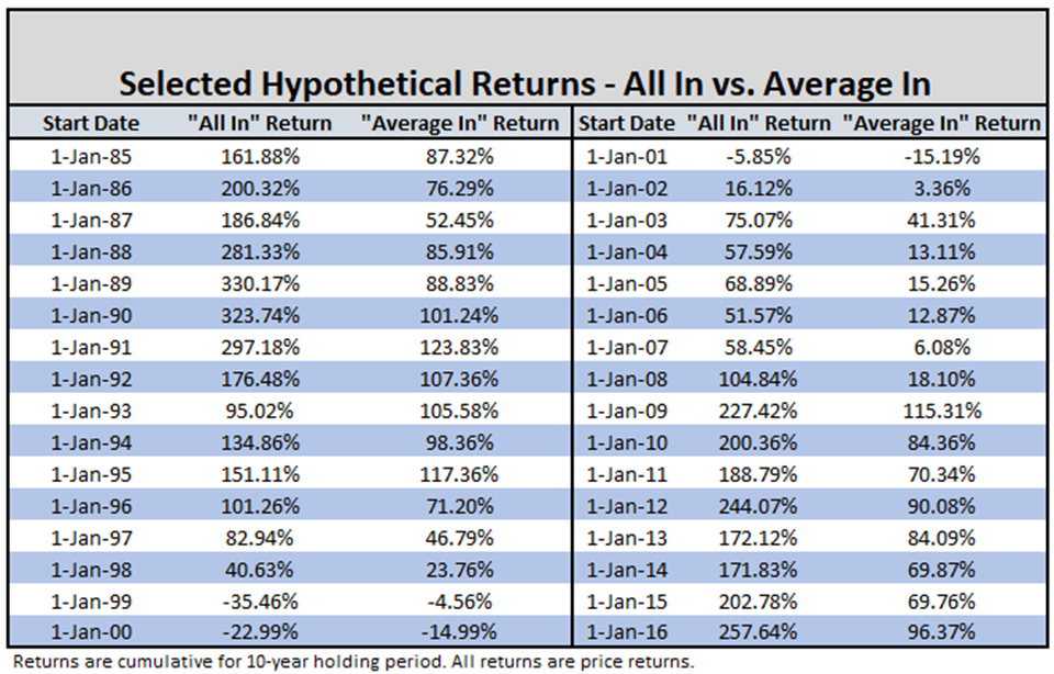 The “Average In” Strategy – This scenario assumes you invested an equal amount of the portfolio in the SPX each month over the entire 10-year period. As with the “All In” strategy, NDW calculated the returns for the “Average In” strategy for hypothetical start dates at the beginning of every month from January 1985 through April 2016.
