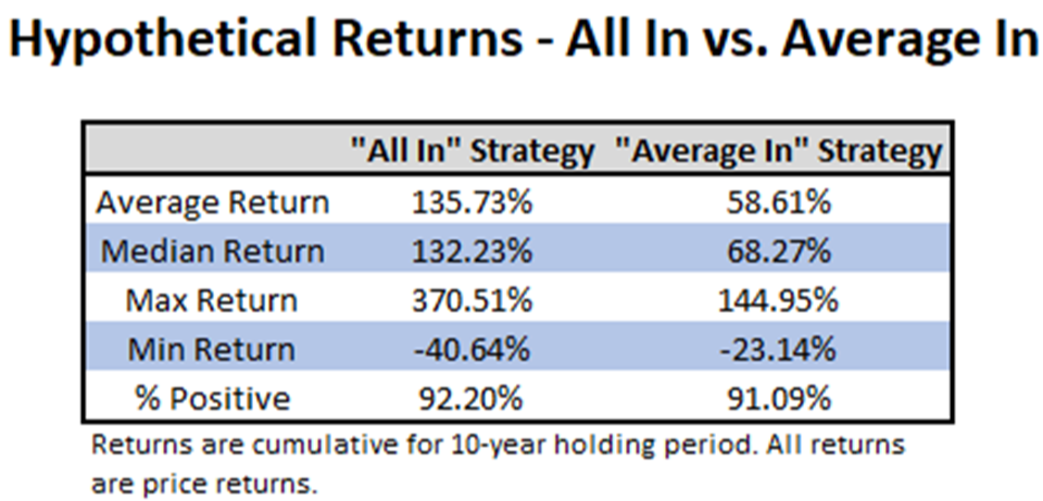 On average, the “All In” strategy outperformed the “Average In” strategy by more than 75% on a cumulative basis. There was also a dramatic difference in the best performance for each strategy - going “All In” in October 1990 generated a maximum 10-year return of over 370%, meanwhile the best return for the “Average In” strategy was a relatively paltry 145%. Not only did the “All In” strategy generate higher average, median, and maximum returns, but it also produced positive returns more consistently, albeit by a slim margin. The “All In” strategy produced positive returns just over 92% of the time.